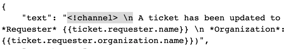 "text": "<!channel> \n {{ticket.assignee.custom_fields.slack_member_id}} \n A ticket has been updated to *{{ticket.status}}* \n *Requester* {{ticket.requester.name}} \n *Organization*: {{ticket.requester.organization.name}}",