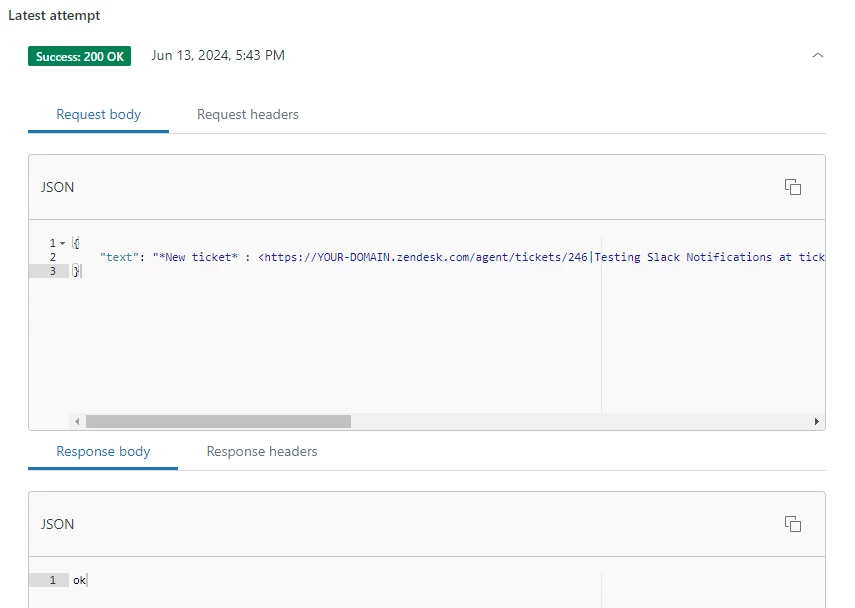 Below is the JSON used in the above example - be sure to update the YOUR-DOMAIN part to your specific Zendesk subdomain.