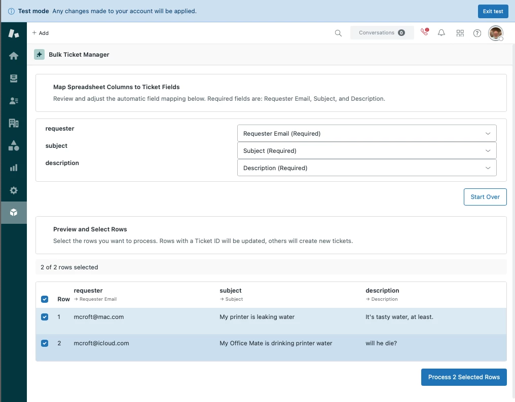 An application that allows an admin to create or update tickets from a spreadsheet in CSV, XLSX, JSON, or Numbers formats. It matches fields and creates users if the user isn't matched.