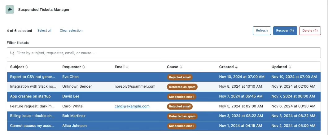 As ticket volumes increase, it can become time consuming to manage the volume of suspended tickets, and if a malicious user sends in tickets in bulk, cleaning them up can be tedious. Adding a management app like this creates an interface designed for bulk management of the suspension queue.