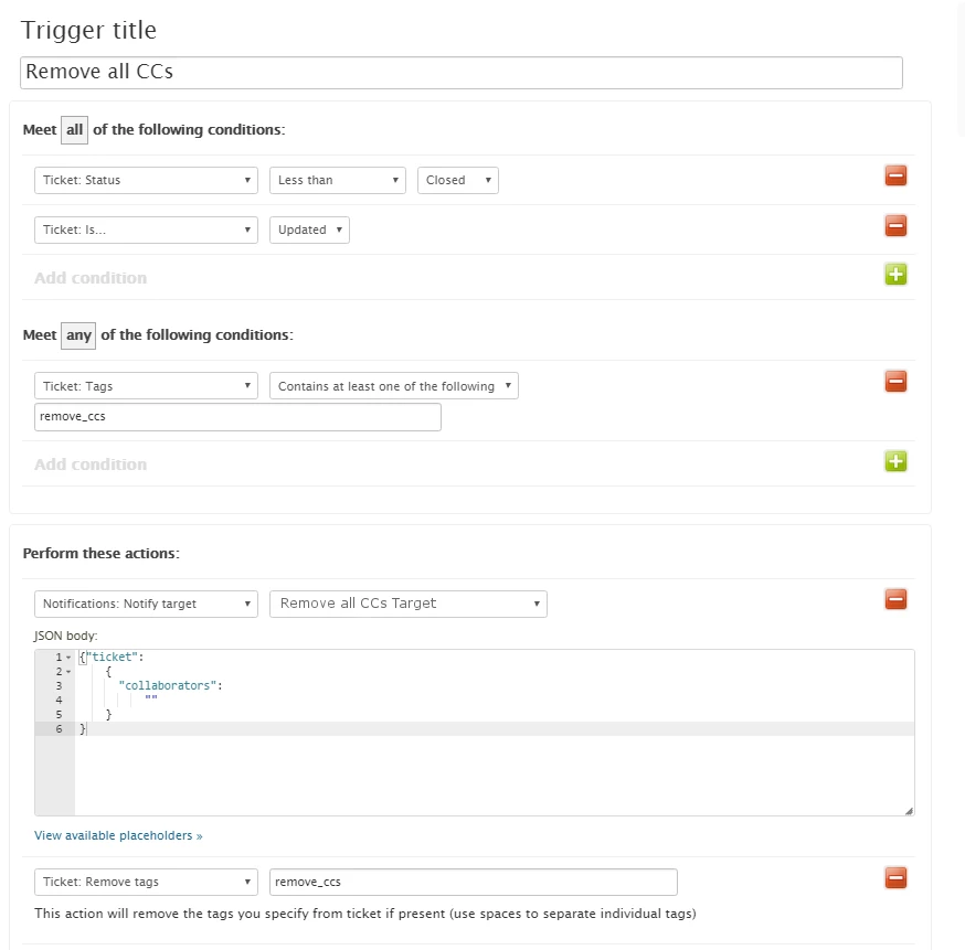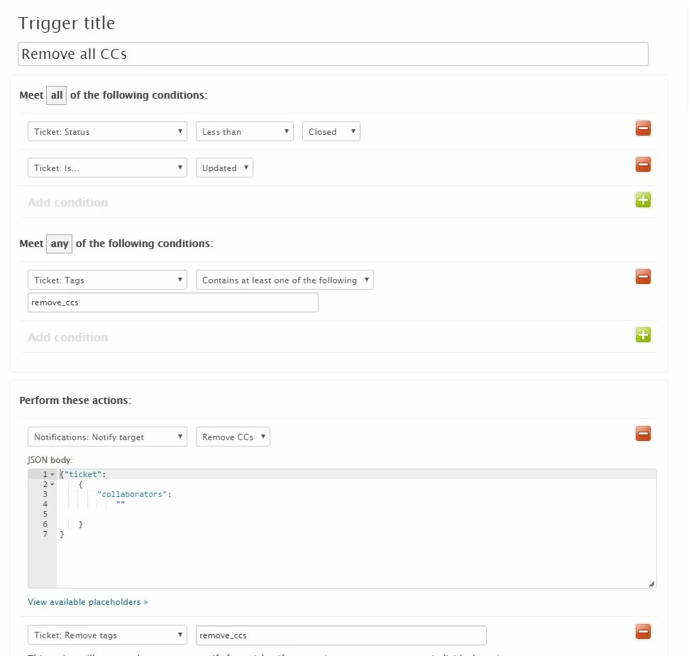 Using HTTP targets, it is relatively simple to create a trigger to remove all CCs from a request.