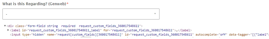 1) Determine the field ID of the dropdown. You can do this from the Ticket Fields page or with the DOM inspector by opening the form in your Zendesk, and then inspecting the dropdown. The screenshot below shows the dropdown on the web page, and the element inspector portion that shows the field ID