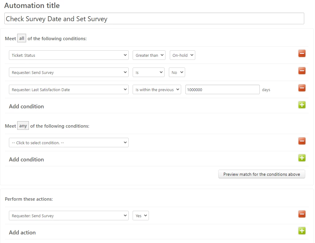 The second automation handles the important task of checking whether the customer who recently submitted a ticket had a survey in the past 30 days. We do this by checking if the date in the "Last Satisfaction Date" is either the current date or earlier and the customer currently has the "Send Survey" field set to No. Both of these fields are set by the 3rd and final Automation which I'll show next. I set this check to look back 1000000 days just so we were covered if the customer hadn't written in for a long while. Here's what that automation looks like: