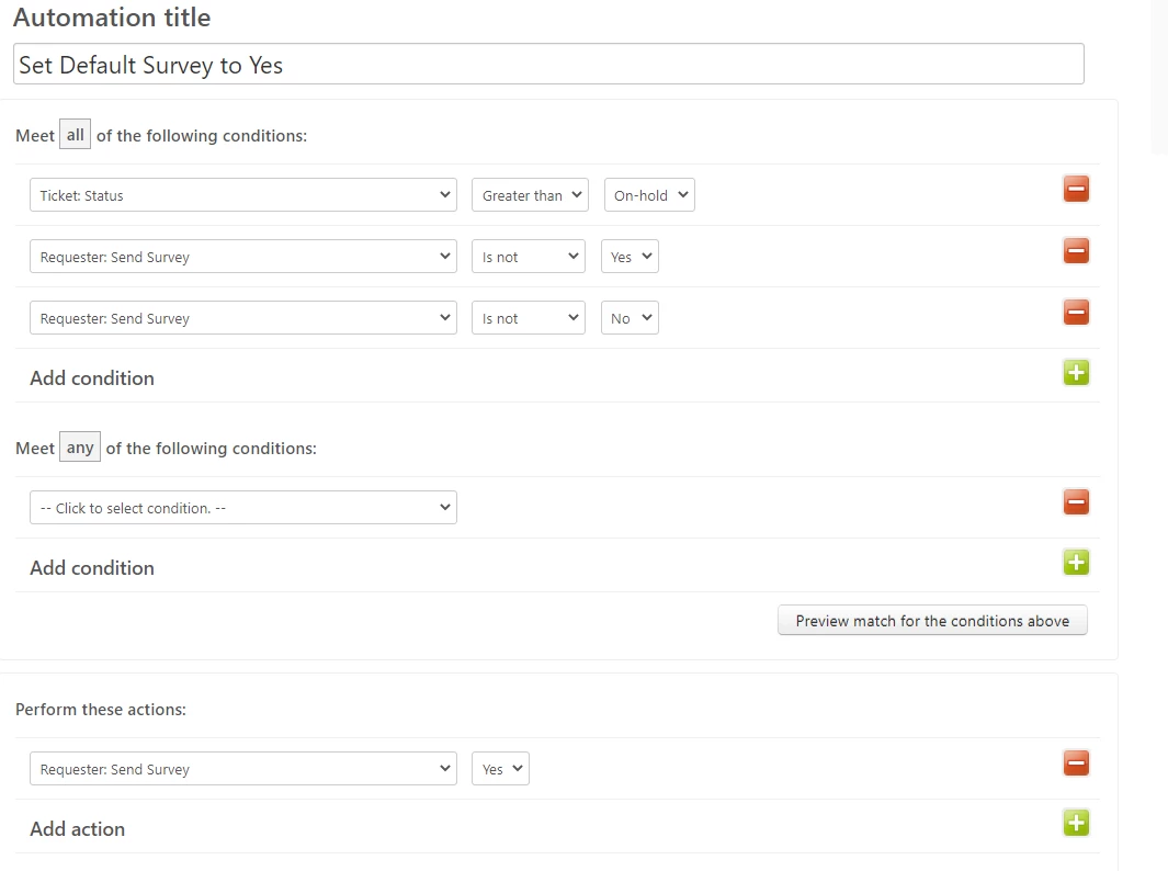 Pretty straightforward, if a ticket is solved/ closed and the requester on that ticket doesn't already have a setting for "Send Survey" give them the default value of "Yes". This automation should only be run once, the first time a new end-user comes into the system but it's an important step to make sure the following automations run properly.