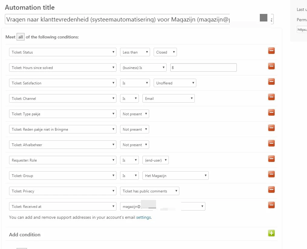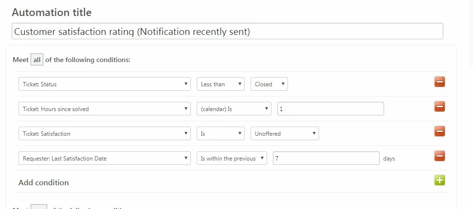 Rename the cloned automation to 'Customer satisfaction rating (Notification recently sent)'. Here is an example of the conditions.
