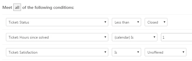 Here the automation will fire if the ticket is not closed, has been solved for an hour and the satisfaction rating is not offered.