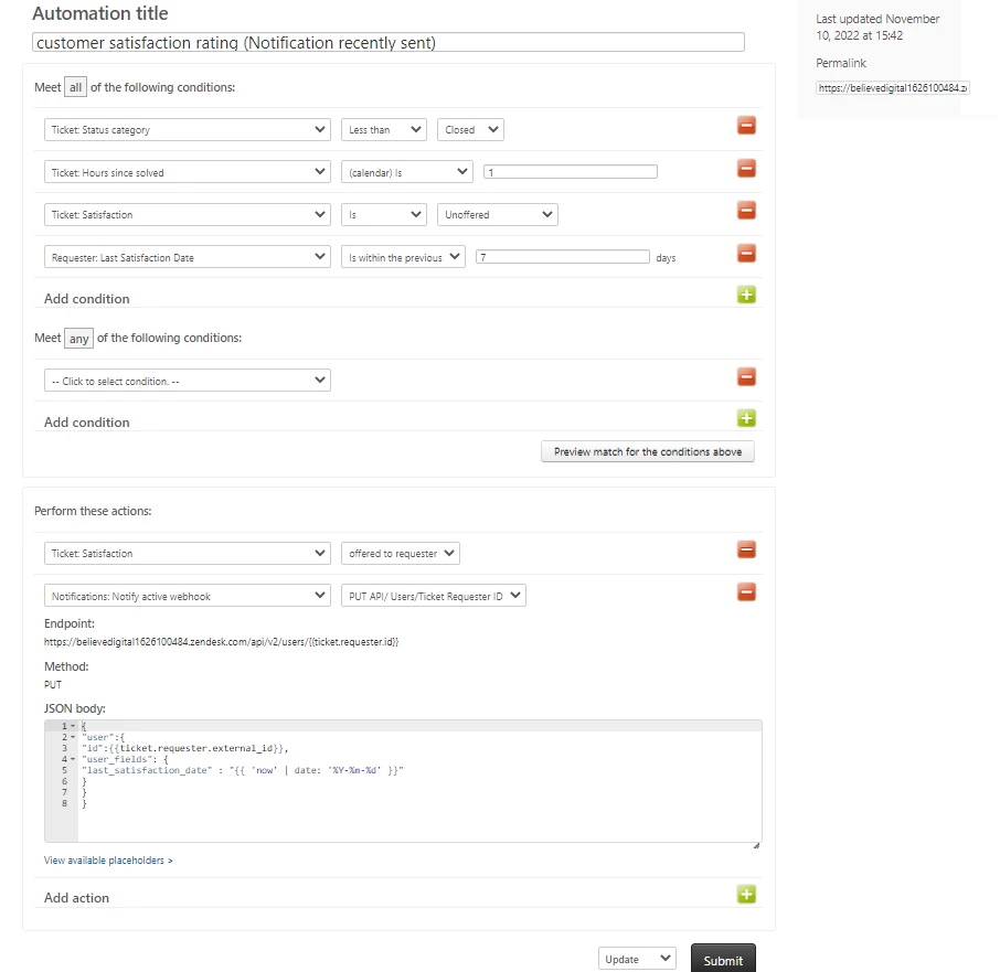 Rename the cloned automation to 'Customer satisfaction rating (Notification recently sent)'. Here is an example of the conditions.