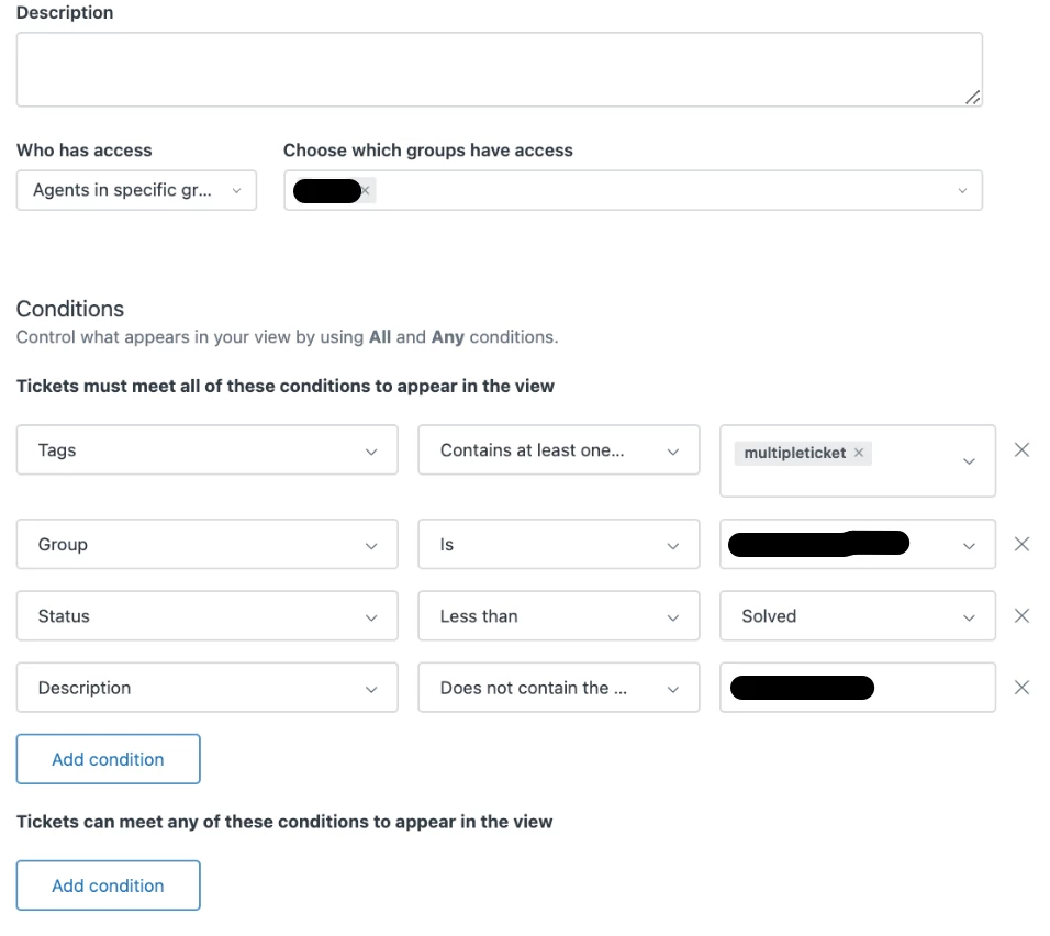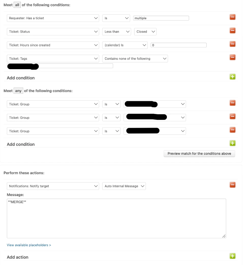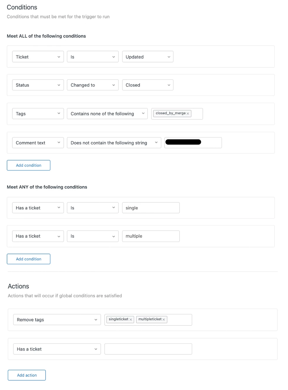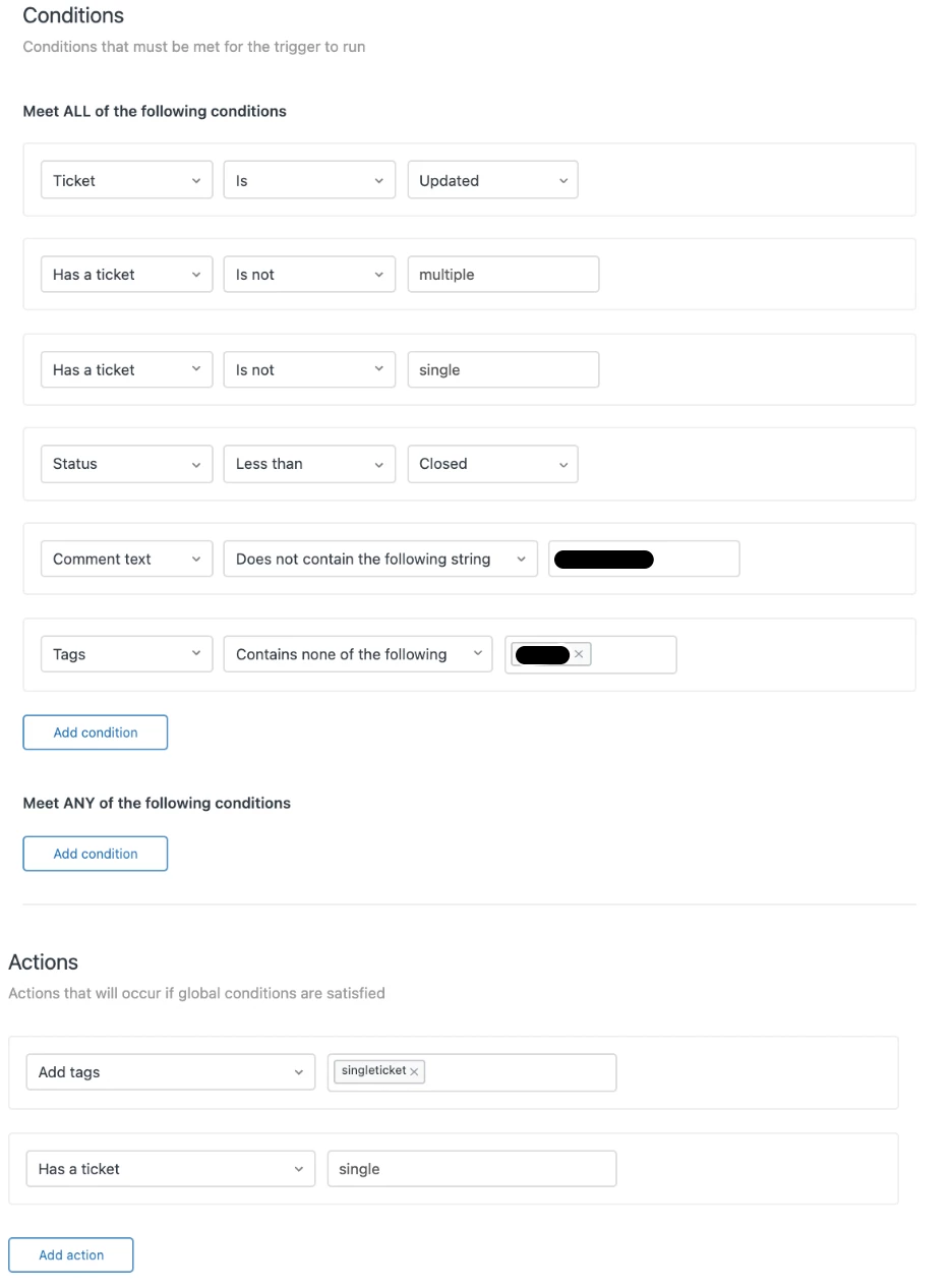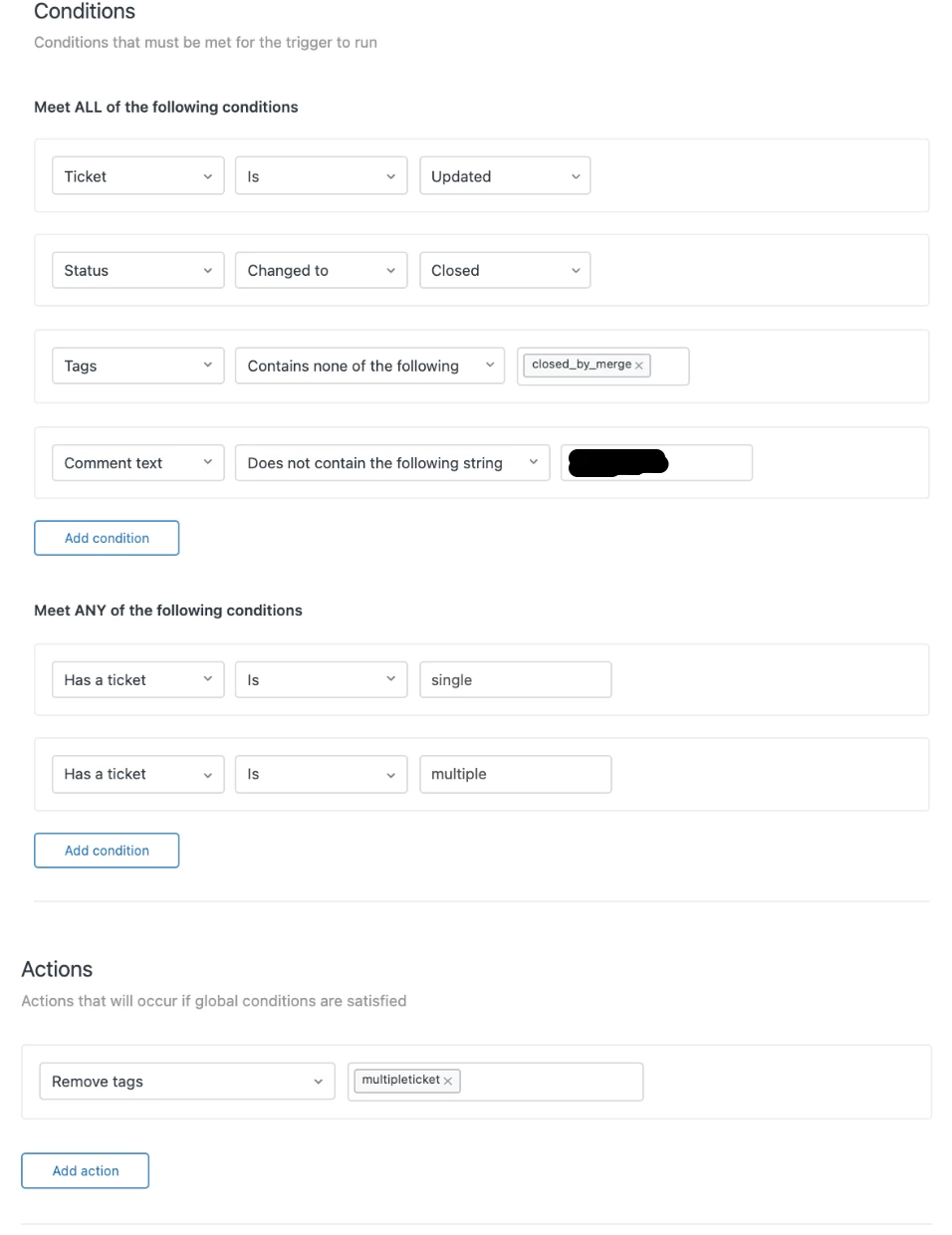 If for some reason, you don’t want these triggers to update specific tickets that you think shouldn’t be merged; you can add more conditions than the ones shown below. As you can see, I personally added conditions for some tags and content text to be excluded from these triggers (these information are hidden on the screenshots for data privacy)