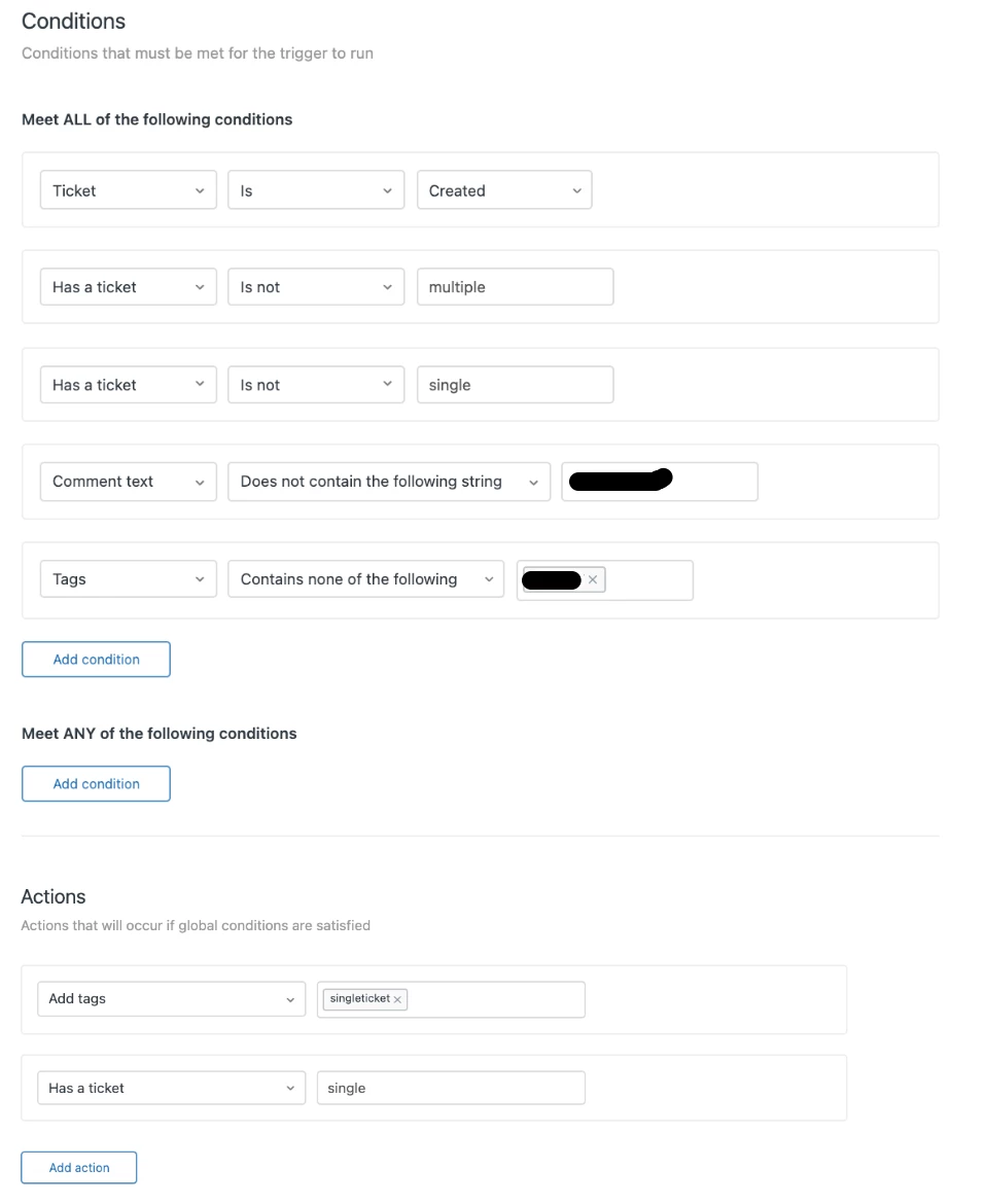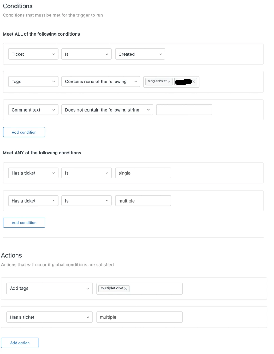This trigger will help you for tickets that are already in your system but haven’t been through the trigger yet (for example, for tickets that your agents create, or that were created prior to the creation of these triggers). Updating these tickets will make them go through this second trigger and be identified as “first ticket”/“single” ticket.