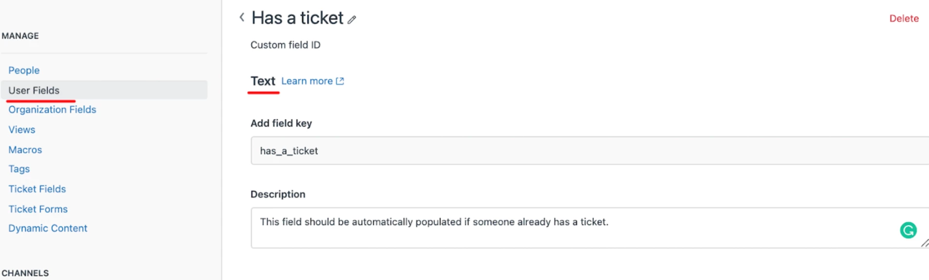 You will need to create a User field so the information of the customer having an active ticket can be linked to his Zendesk profile. For flexibility purpose, I chose a Text custom field that we will fill in later and use as a condition for our triggers. We will: