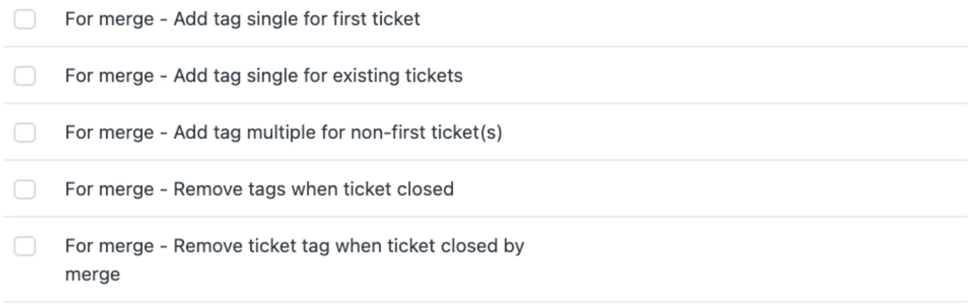 The ticket tag will be used to display the tickets in a merge-dedicated view and to start an automation, which will send an internal note in the ticket for the agent to see. A custom user field will also be used for the trigger system.