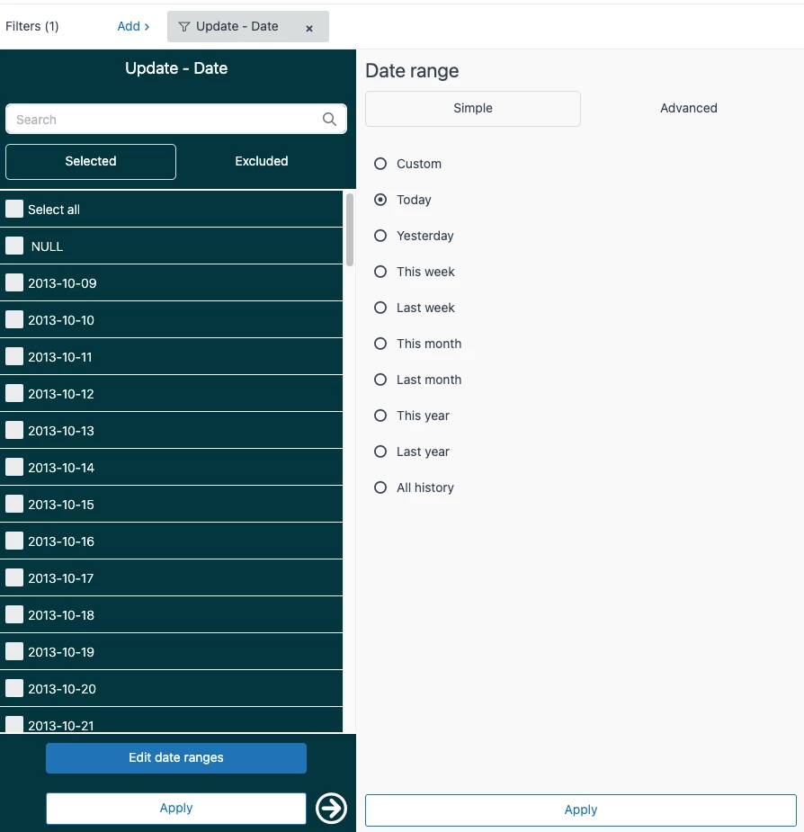 2. The “Update - Date” filter will automatically populate. The date can be set to whatever you like dependent on what data you're looking for, but for this specific example, we'll set it to “Today”. You'll also want to add another filter for “Updater role” and select the values “Agent” and “Admin” (unless your setup requires otherwise.