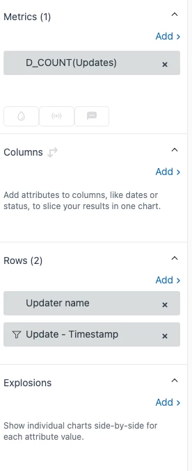 3. For your metrics, you'll just want to add the “Updates” metric and make sure it's set to D_COUNT. In your rows section, you'll add the “Updater name” and “Update - Timestamp” attributes.