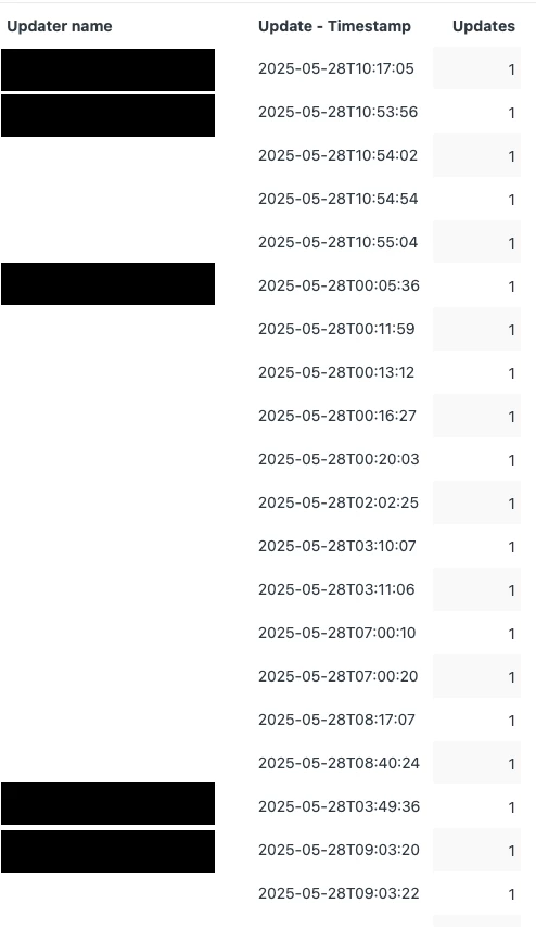 4. This will give you a table that looks something like below. I've redacted names for obvious reasons, but as you can see this provides timestamps for each update from our agents. We can take this one step further with Result Manipulation.