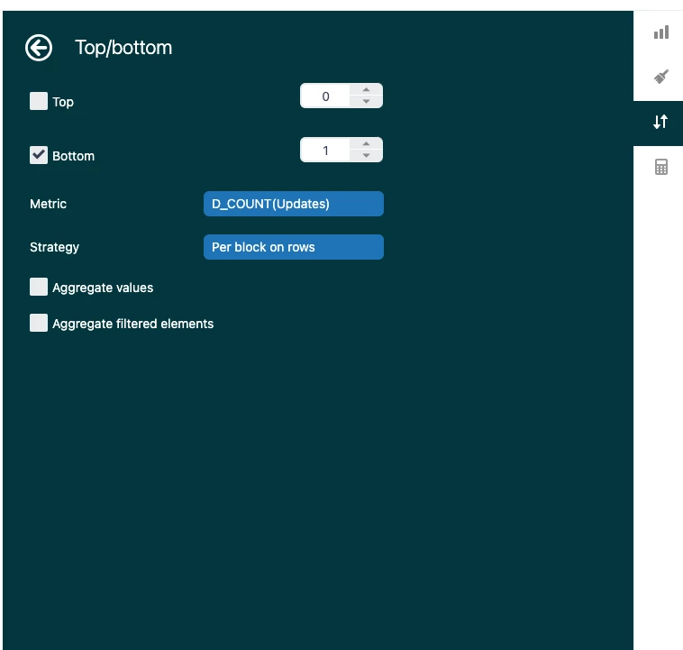 5. In the result manipulation tab on the right hand panel, you're going to select “Top/Bottom”. That should open a screen that looks like the below screenshot. This is where the magic happens. You'll want to check the “Bottom” checkbox and set the value to 1. You'll also switch the “Strategy” drop-down value to “Per block on rows”. This will show only the most recent timestamp for your agents.