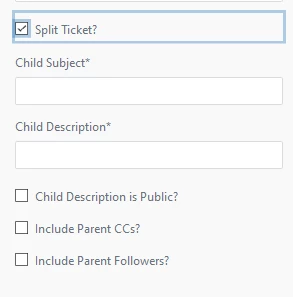 Drop all of those on your form(s). I set a condition to hide all of the fields when Split Ticket? is unchecked. I also require Subject and Description. Note that if you don't have conditional fields, requiring those fields might be problematic. If you leave them as optional you MUST fill out the description otherwise ticket creation will fail.