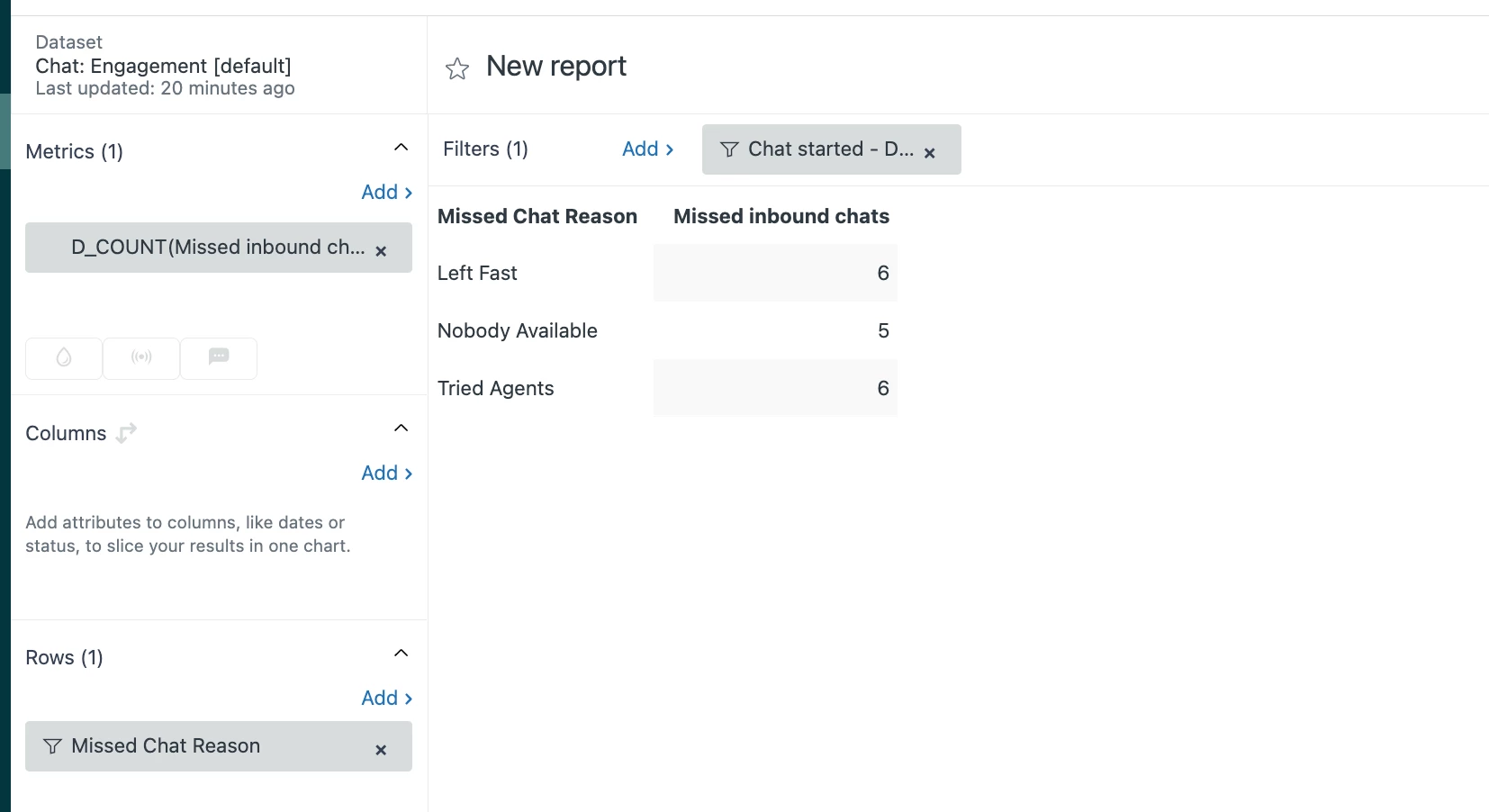 Here’s the end result, the top Metric is Missed Inbound Chats, and I've filtered to a specific time range.