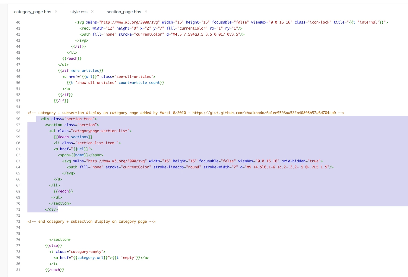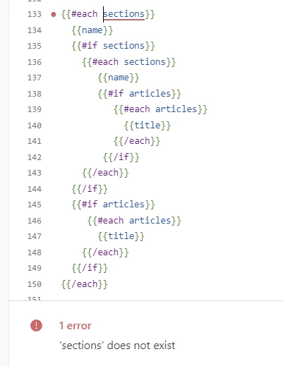 In the category_page.hbs file, replace the {{#each sections}} block with the following: