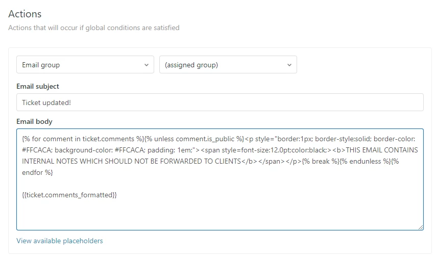 It's handy to collaborate or refer tickets to other teams by assigning tickets over or using the @mention feature, however some workflows may require the entire ticket history to be included in an email, using the ticket.comments_formatted placeholder.