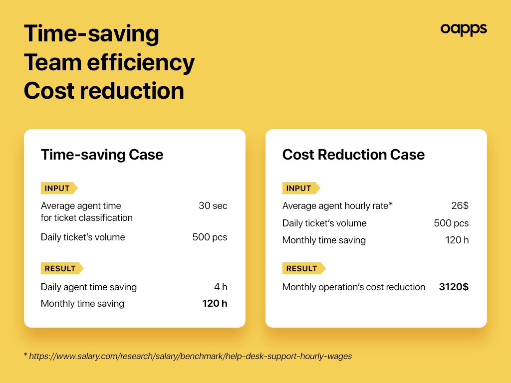 - At least 10% reduction in agents' labor costs (for determining the type of request, selecting the appropriate algorithm for working with it, and then routing it to the performer)