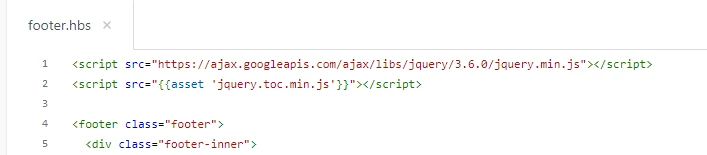 3). Now, link the jquery.toc.min.js file and the jQuery library onto your document_head.hbs file, the plugin is jQuery based.