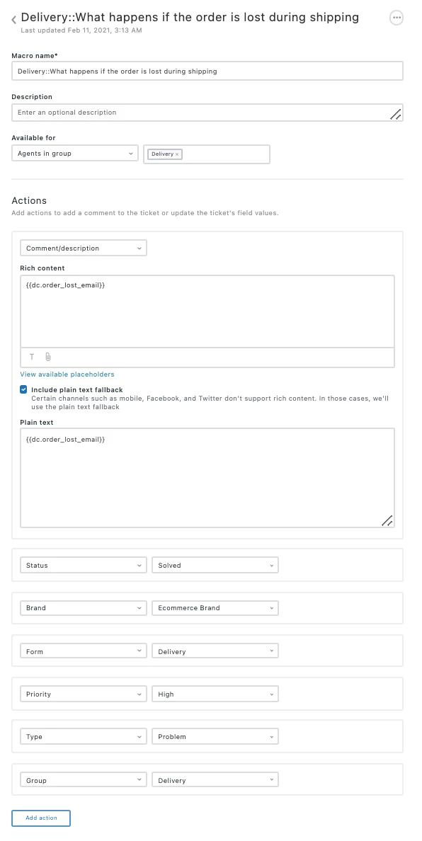 Add all standard and custom actions. Macros serve great by setting many system and custom fields values, tags, etc in one shot. It makes sense to replicate all relevant actions even if some of them are set by business rules in Zendesk. Why? Because you never know when you could have a case when you need to do this manually and having all actions in the macro saves your time in any future case. The same applies to the plain text version of the comment: add it by default to avoid unnecessary edits for channels that do not support Rich content formatting. This is how the actions list might look like with all actions added.