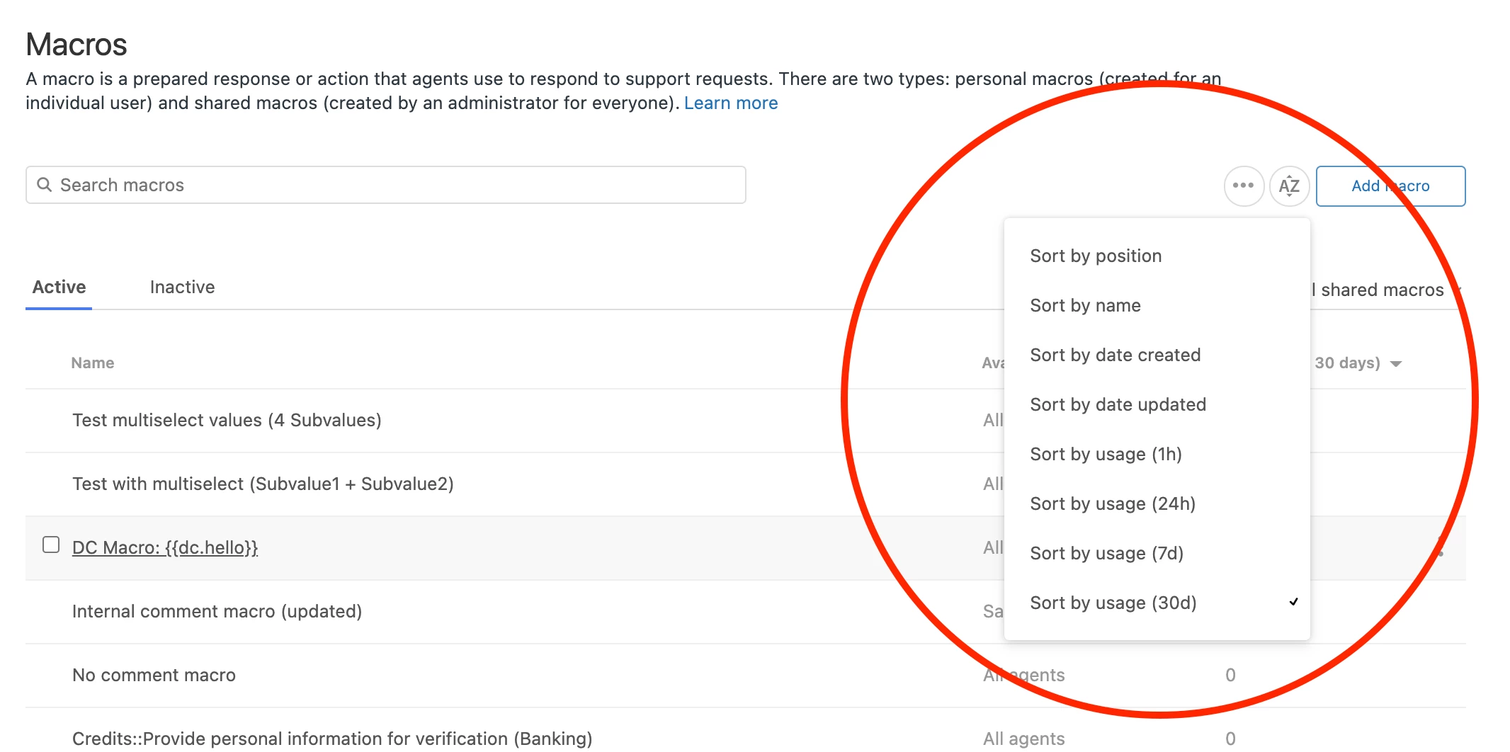 Using stats on Macros page. If you have Zendesk Professional plan or above you can check usage stats for up to the last 30 days. Go to Admin > Manage > Macros and select a period in the sorting menu. With a regular monthly checkup, you can save your stats into a sheet and have these general usage numbers tracked. Clearly, that you don't have any additional context (except groups using macros) to analyze usage.