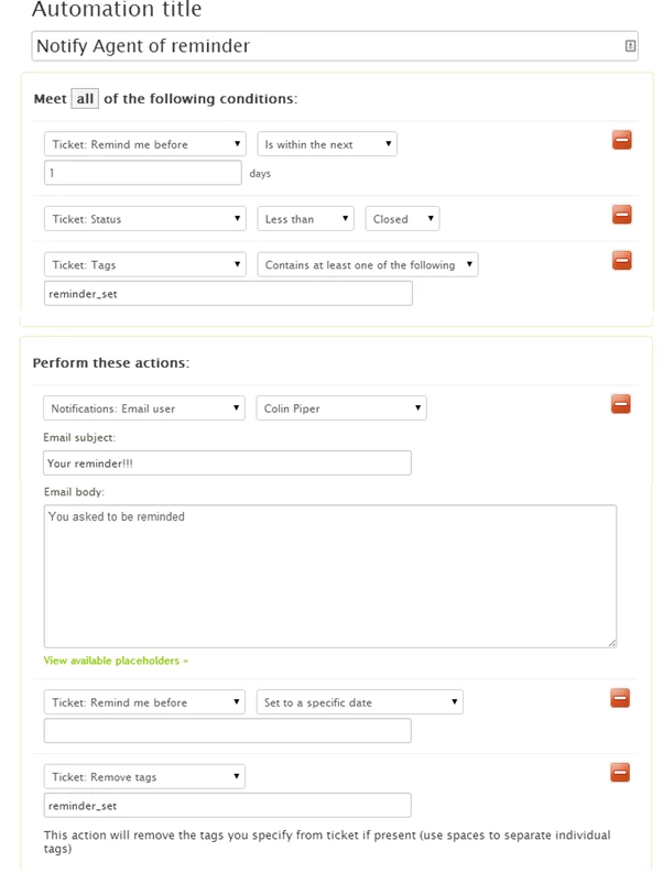 For now though, create an automation similar to one the one in the screenshot. In this automation we test for the tag and when the reminder is due and then send an email, blank out the date and remove the tag.