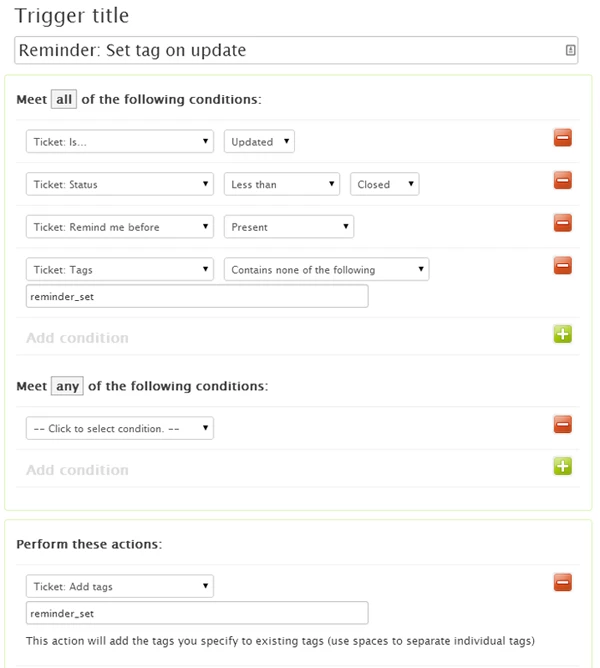 Now we just need to deal with the requirement to have the tag to nullify the conditions of the automation. This requires a trigger. This trigger will fire when a ticket is updated and if a date is present, then add the "reminder_set" tag.