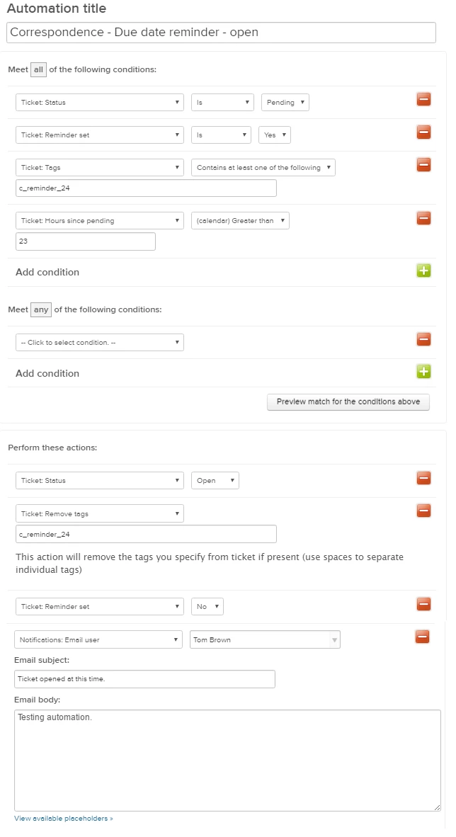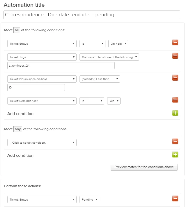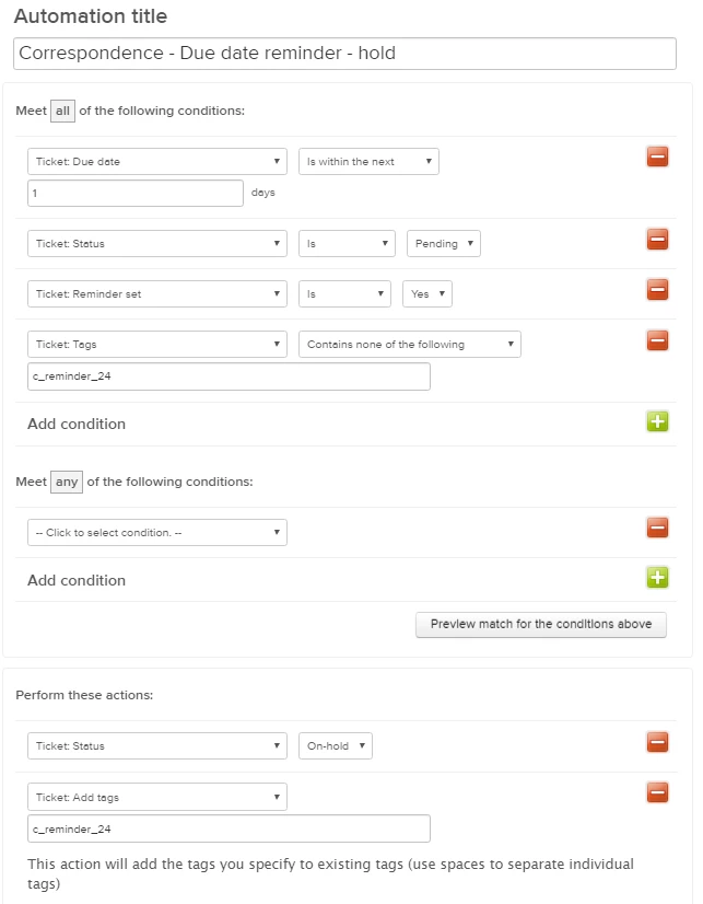 Automation fires if - field "Reminder set" to YES, less than 1 day until due date. Action: adds tag c_reminder_24. Also changes ticket from Pending to On-Hold.