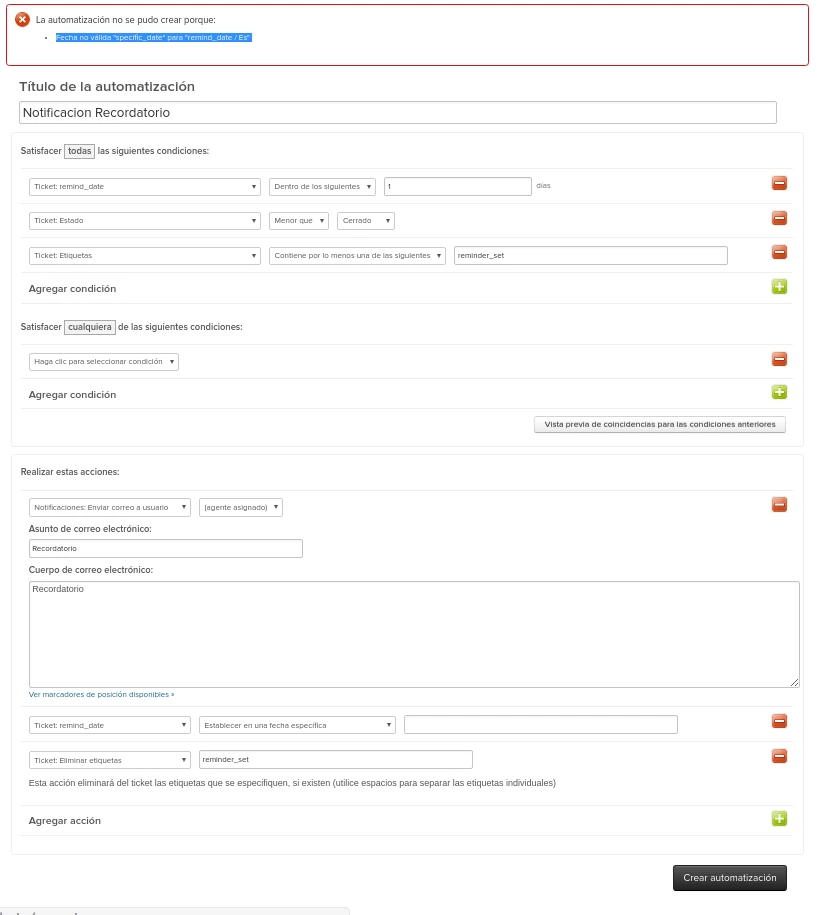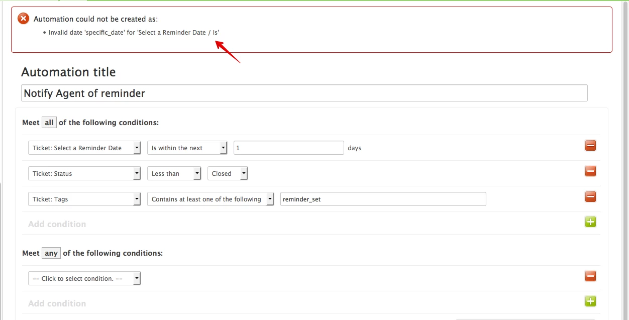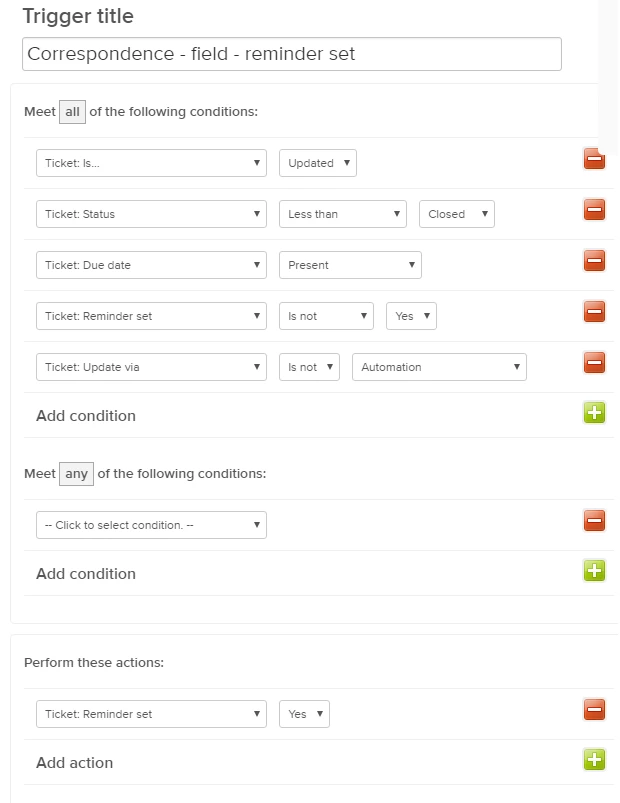 Now we just need to deal with the requirement to have the tag to nullify the conditions of the automation. This requires a trigger. This trigger will fire when a ticket is updated and if a date is present, then add the "reminder_set" tag.