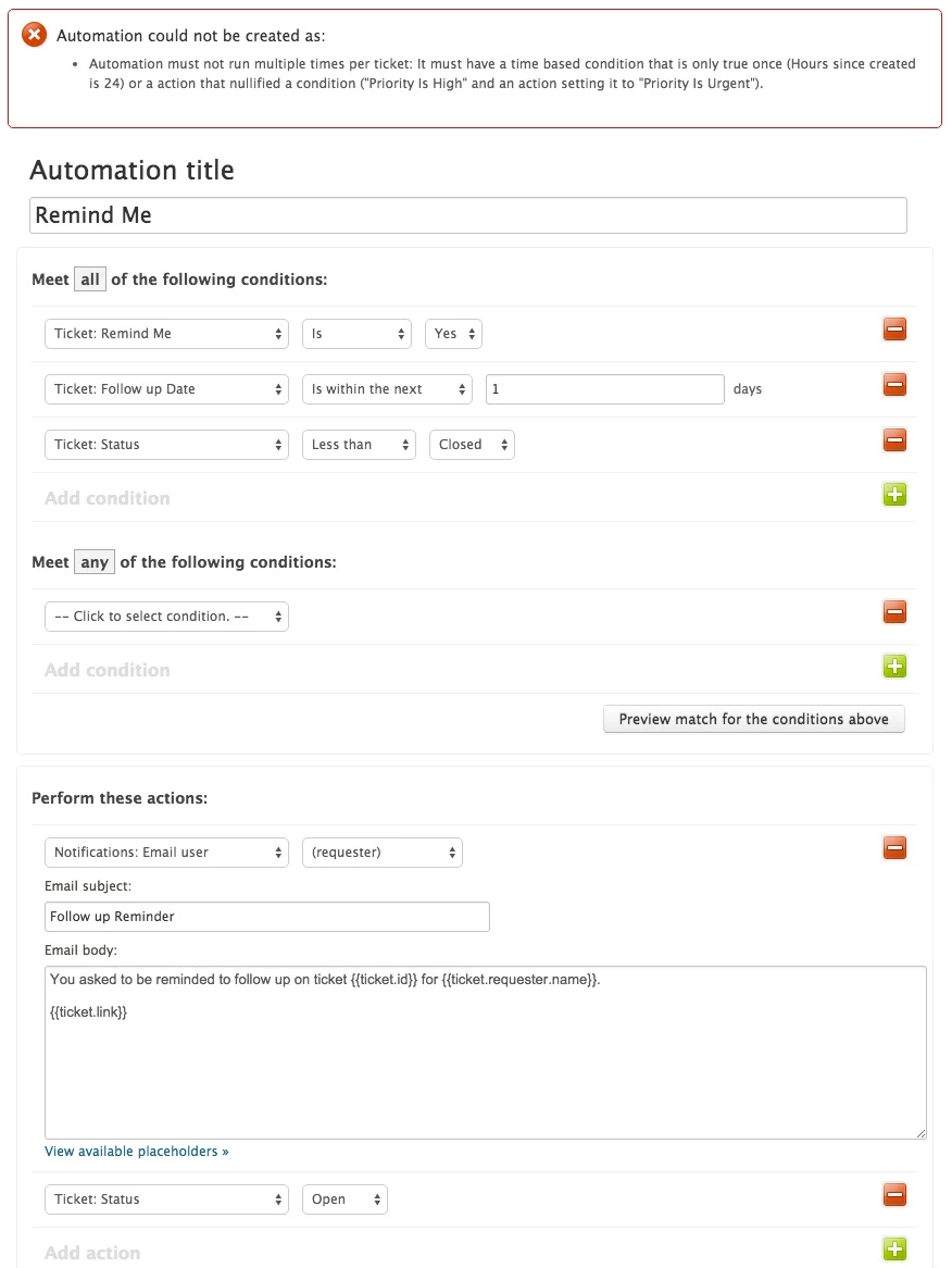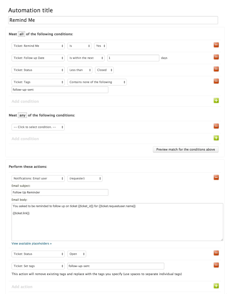 Automation fires if - ticket with tag c_reminder_24, "Reminder set" field YES, and time since pending is greater than 23 hours. Action: trigger email and change ticket to open. remove tag c_reminder_24 and set custom field to No.