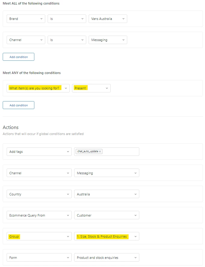 Ensuring that the specific ticket field is present - you can leverage off this to then set your trigger actions accordingly. As shown below I've ensured that when this particular ticket field is present in a Messaging conversation, that the ticket will be presented specifically to our Products group (Sales).