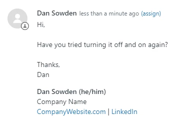 As soon as this has been configured, all public updates will automatically be suffixed with the signature and will be included in emails and ticket updates as viewed on the Zendesk request portal.