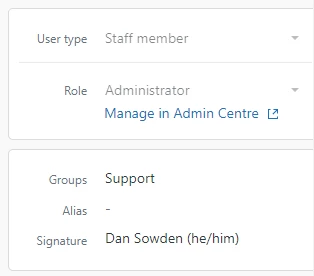 This can easily be achieved using the signature functionality - so agents can then add in their gender pronouns if desired or not if they prefer not to: