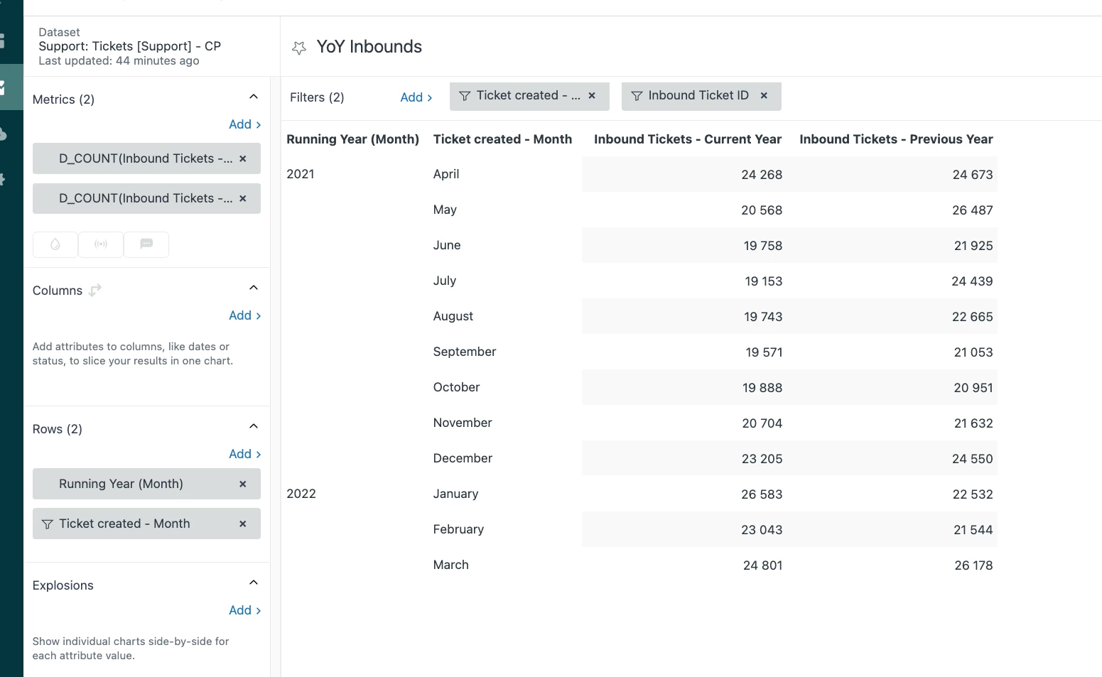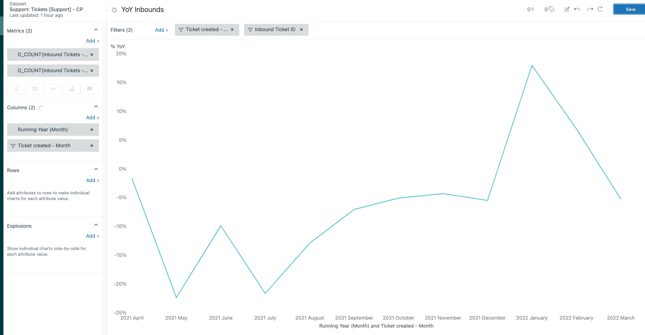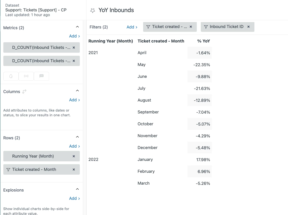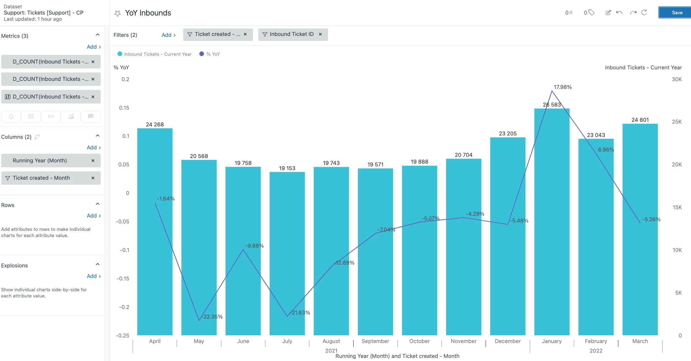 I wanted to share some steps I came up with for reporting ticket volume in a way that allows you to see % change year-over-year by month. This requires creating custom metrics and attributes in Zendesk Explore. Hope this is useful to some folks out there in Explore world!