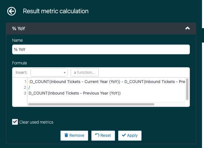 7. Use the "Result Metric Calculation" option to create a new YoY comparison metric. The formula there would be (Current Year - Previous Year) / Previous Year. Be sure to check the "Clear used metrics" option: