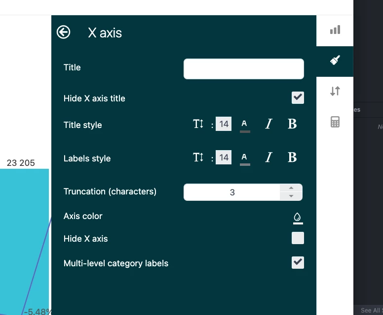 12. Do some clean-up/cosmetic work. I usually remove the "show applied filters" option, and I like to use the "multi-level" option on the x-axis, put the legend at the top, and display the values, etc.