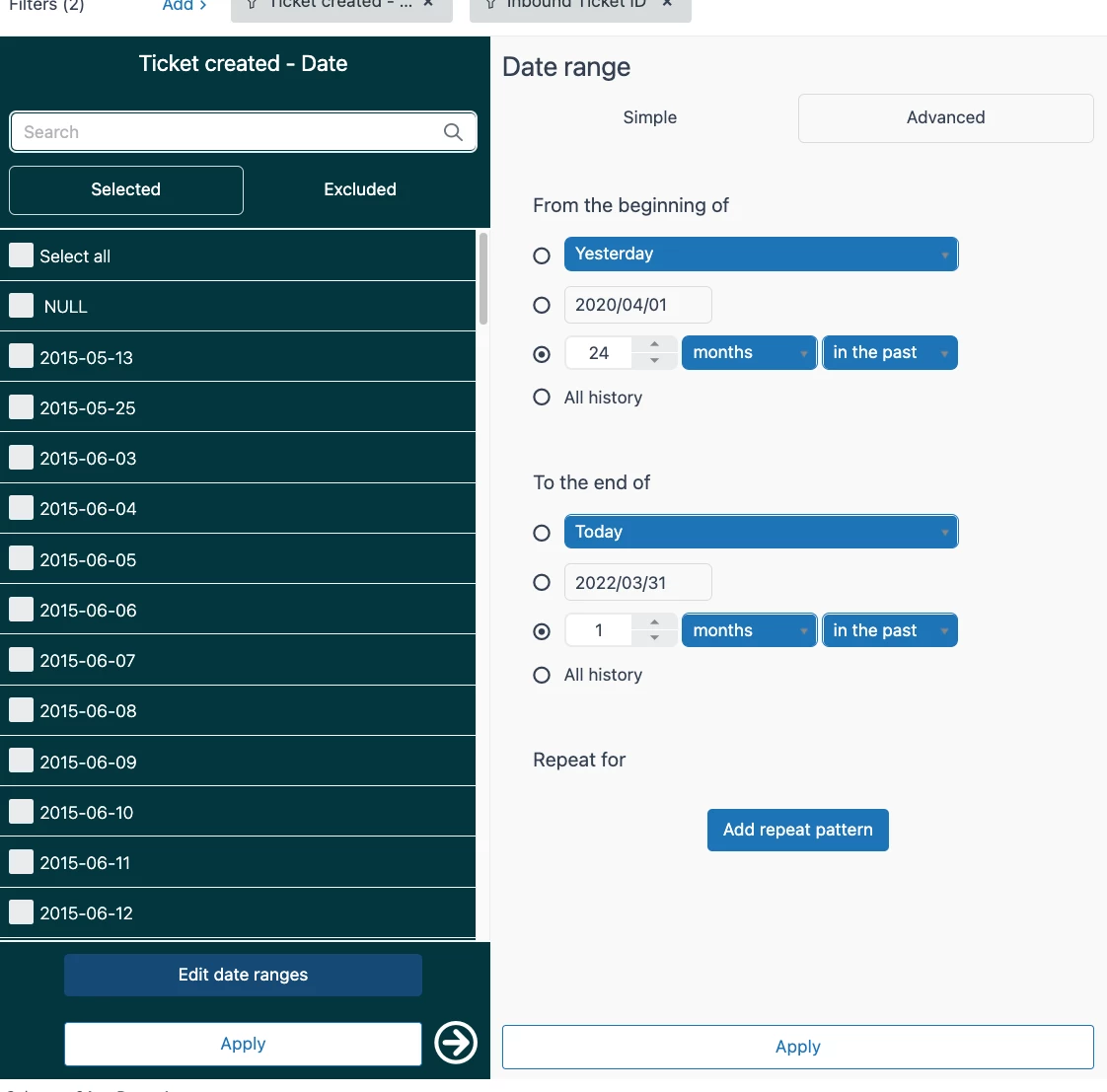 4. On your query, Add a Date Range filter to grab tickets created in the last 24 months.