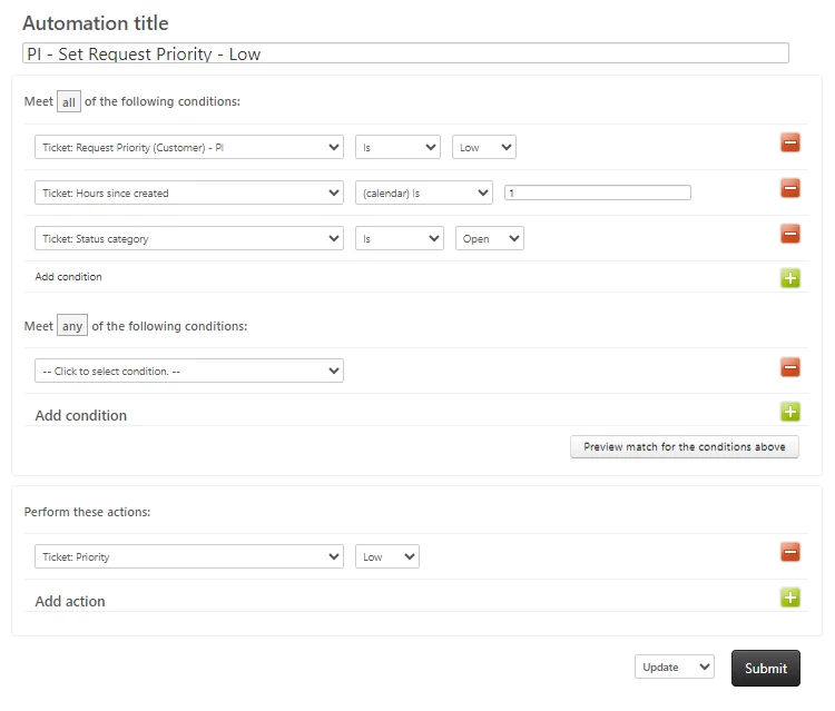 The issue here is the rule won't trigger for an hour and I can't seem to work out how to have the rule trigger upon ticket submission, is this possible?