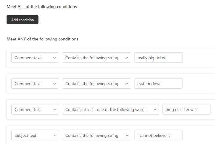 To do so, use a trigger for rules based on ticket updates and text.