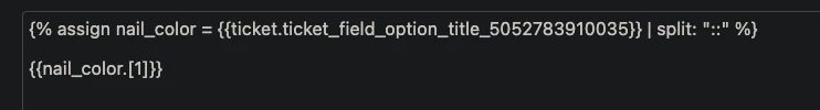 {% assign compcategory = {{ticket.ticket_field_option_title_1234}} | split: "::" %}