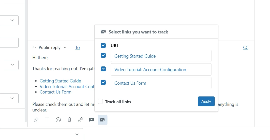 Link tracking provides this visibility by showing when a customer clicks a link inside an email. This can help agents understand engagement levels and adjust their communication accordingly, for example, following up when a link hasn’t been opened or refining how information is shared.