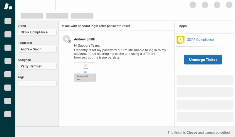 To address this, we’ve introduced a new Unmerge Tickets process in the GDPR Compliance app. It allows you to safely split previously merged tickets without losing important data. Each unmerged ticket retains its requester, subject, tags, ticket fields, and conversation history (including all comments and attachments), ensuring consistency and data integrity.