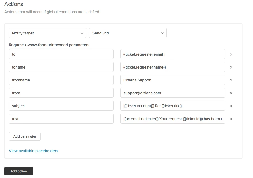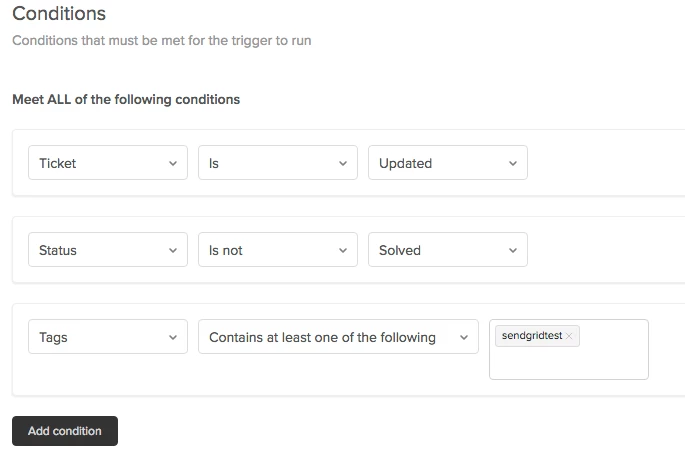 - Change Conditions of Trigger (Ticket is Updated, and Status is not Solved, and Tags contain "sendgridtest").