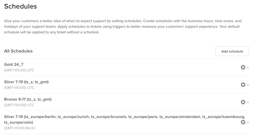 These were needed to apply the combination of SLA and Schedule onto every new ticket - one for each contract/timezone. We used the appropriate contract tag to set the relevant schedule.