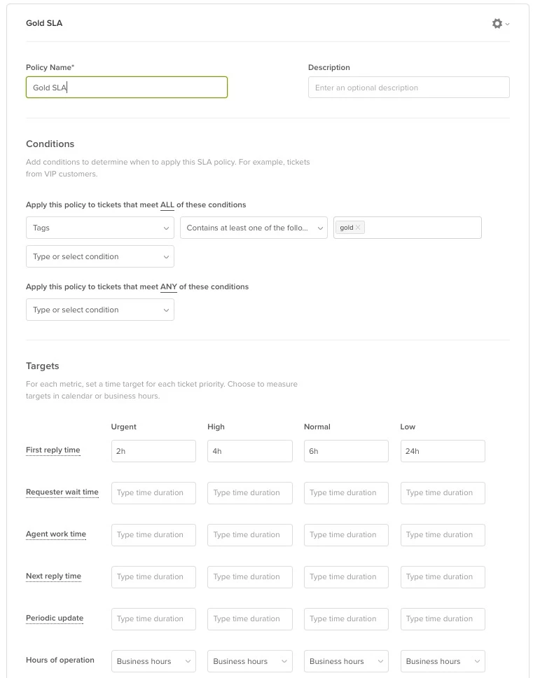 We use 4 of these - one for each contract - gold, silver, bronze, custom. We then utilize the "First time reply" target and the "Business hours" option, setting the appropriate values for urgent, high, normal and low.