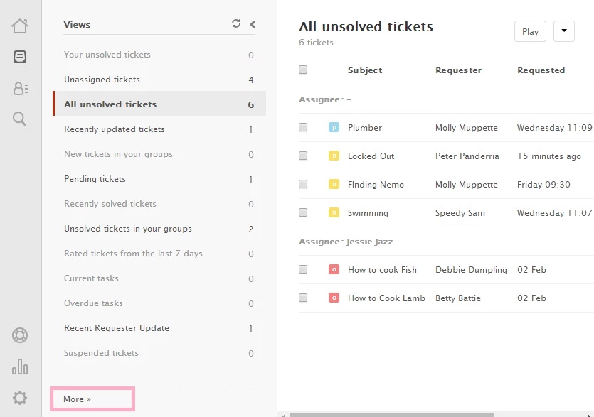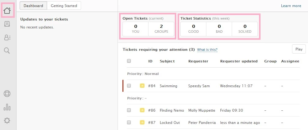 While these views cannot be customized, they do provide ticket details to all agents. To access the default views, click the home button on the sidebar: