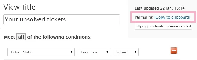 Always give clear and accurate descriptions to view titles. For example, ' Urgent, Unsolved Tickets' could describe the ticket conditions that make up the view. It would be misleading to name the view 'Unsolved Tickets' or 'Urgent Tickets'. It would be unhelpful to name the view 'Ticket Listing'. If you later modify the conditions in a view, you should consider modifying the title of the view to reflect the new conditions.