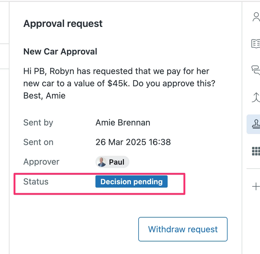Thank you for your suggestion! Integrating an "Approval Status" drop-down field that automatically syncs with the app sounds like a great idea. This would definitely enhance the tracking of approval requests and improve the clarity of status updates.